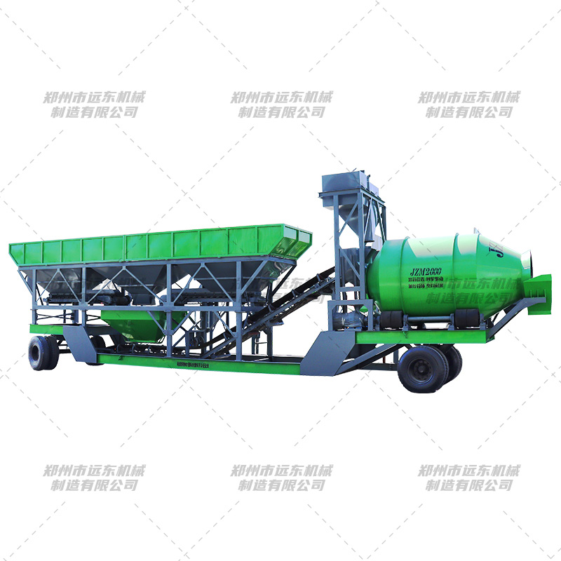 移动搅拌站,是一种可移动的混凝土搅拌站设备。通过设计,把搅拌站的配料系统、称量系统、搅拌主机、储料、卸料以及自动控制系统集中在一个拖挂单元,通过拖车实现搅拌站的移动。搅拌主机减速机、计量传感器、和控制系统的主要电气元件均采用进口元件,不仅大大地降低了设备的故障率,而且提高了设备的计量精度。整机采用计算机控制,既可自动也可手动操作,操作简单,易于掌握。动态面板显示,能清楚了解各部件的运行情况,同时可以存储、打印报表资料,为生产调度管理提供了方便。 1、滚筒移动搅拌站外部设有骨料配料装置及输送砂、石骨料用的皮带输送机。 2、骨料储料上架设皮带输送机的机头和支架,骨料预加料斗(储存已混合、称量好的骨料)。它们将按配比称量好的骨料传送装置卸料到混凝土搅拌机内。 3、搅拌机平台上装有台滚筒搅拌机,在其上部是计量装置,按配比分别称量水泥、水、塑化剂等的用量,待称量完毕后,卸入搅拌机内,连同称量好的骨料进行搅拌,搅拌均匀的混凝土可以卸料到混凝土运输车中运走。